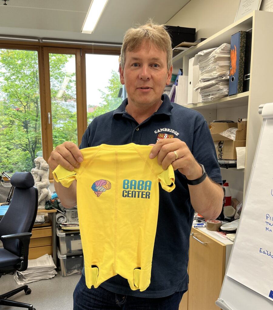 Kliinisen neurofysiologian erikoislääkäri ja professori Sampsa Vanhatalo vakuuttaa, ettei keltainen puku hienosta designistaan huolimatta ole kuluttajille suunnattu hyvän vanhemmuuden lisälaite vaan suunniteltu tutkimuskäyttöön.